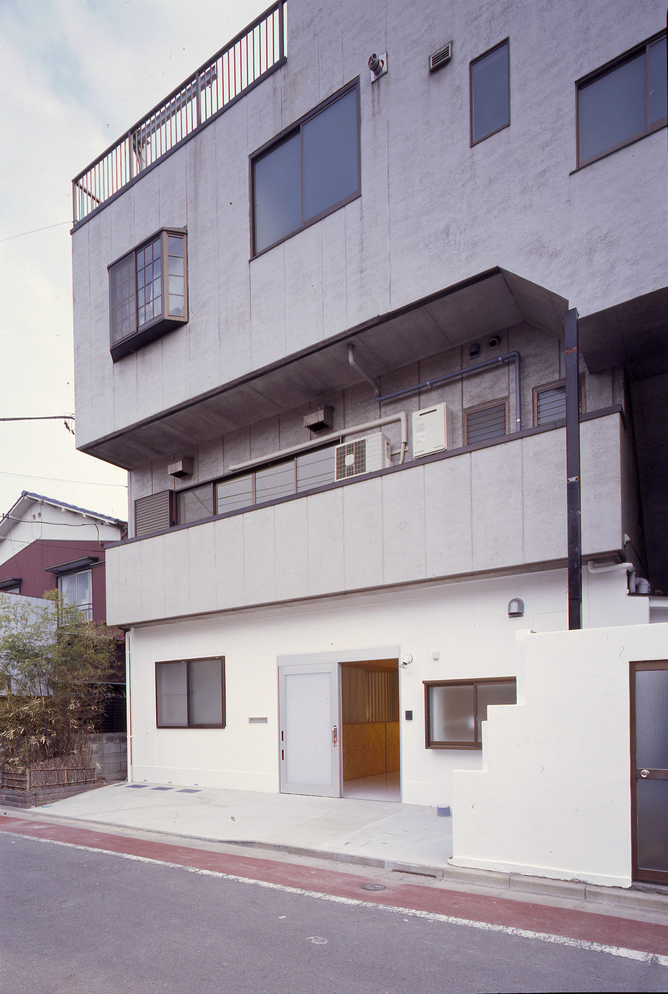 角地で傾斜地に建つ住宅です。傾斜を利用して、地下には4台の駐車場を配置。玄関からのアプローチにパーティルームへ直接アプローチできる動線も確保。