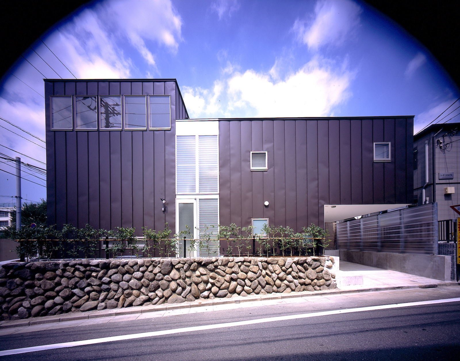 角地で傾斜地に建つ住宅です。傾斜を利用して、地下には4台の駐車場を配置。玄関からのアプローチにパーティルームへ直接アプローチできる動線も確保。
